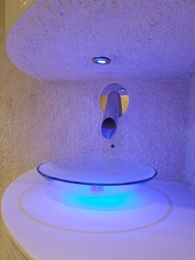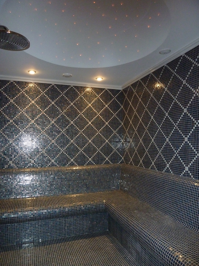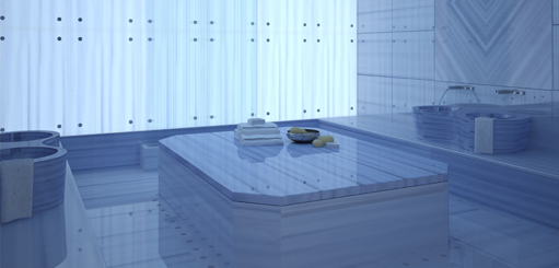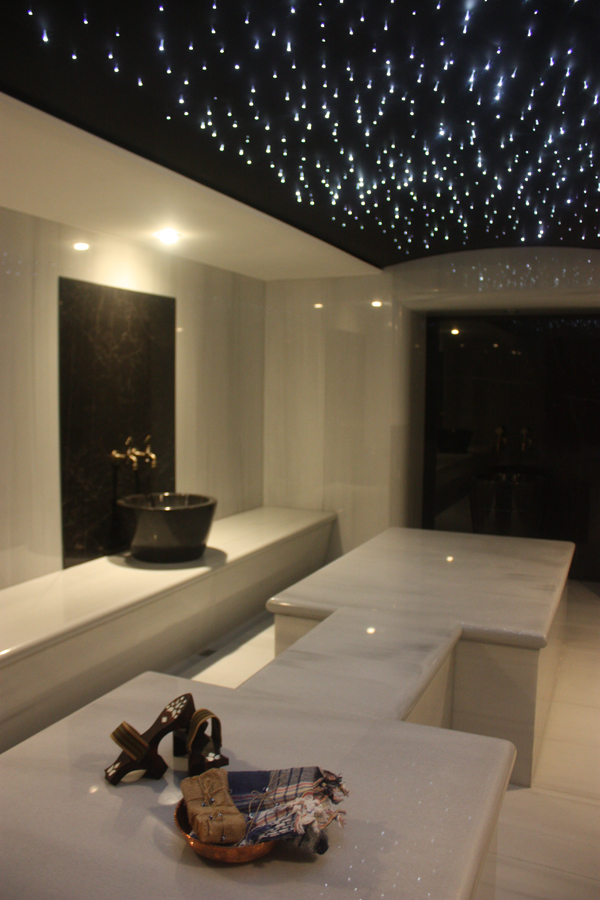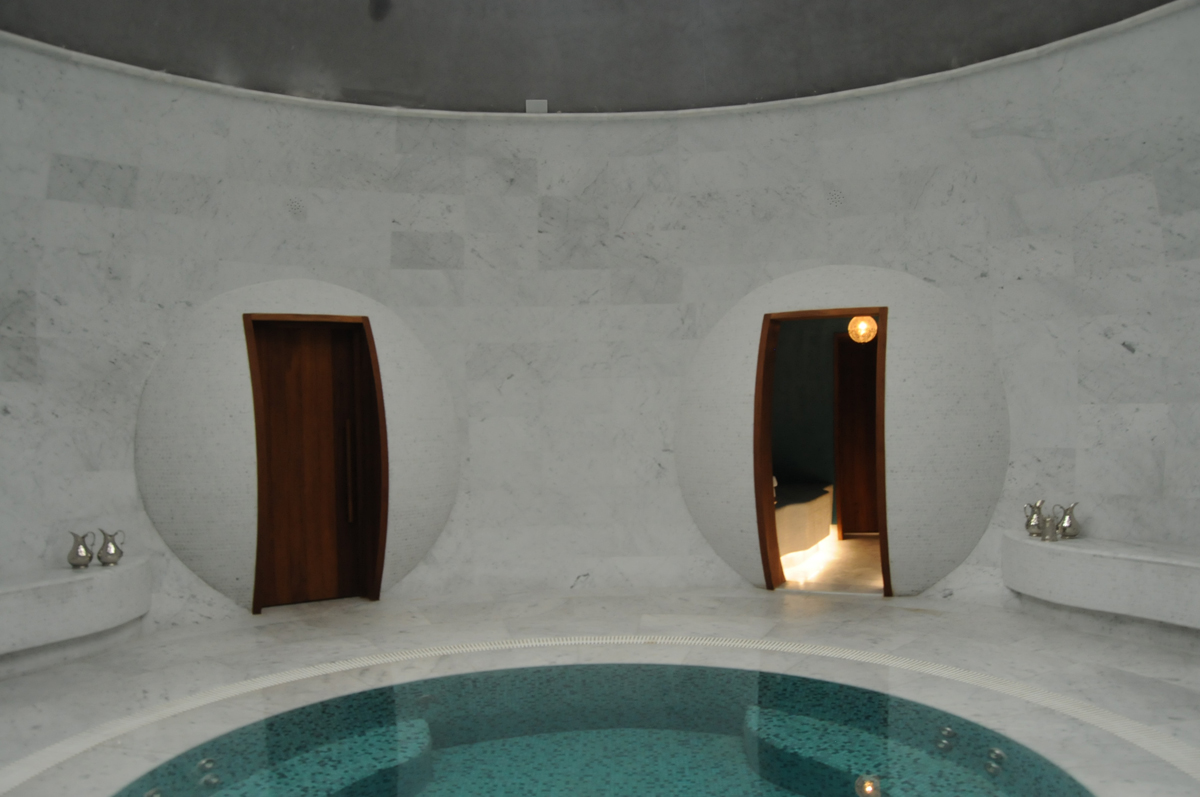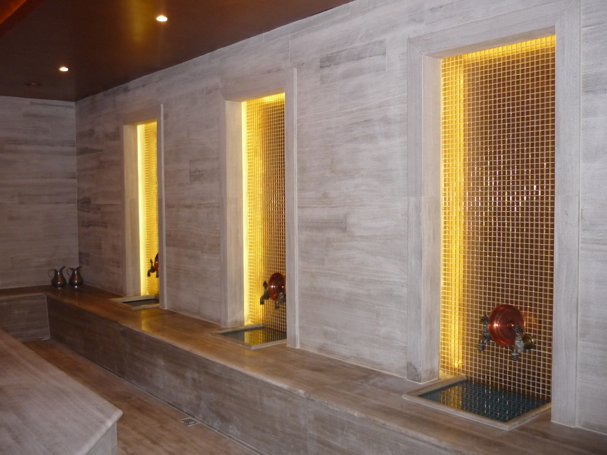 Specially designed Turkish hammam, VIP hammam sections, hammam relaxation area, steam rooms, Finnish sauna enriched by chromotherapy, shower tunnel equipped with adventure shower systems, ice fountain and special steam bath applications at VIP rooms were realized in 2009 by Promet in Kuum Spa of Kuum Hotel in Bodrum Türkbükü, which has a magnificent view and location.
